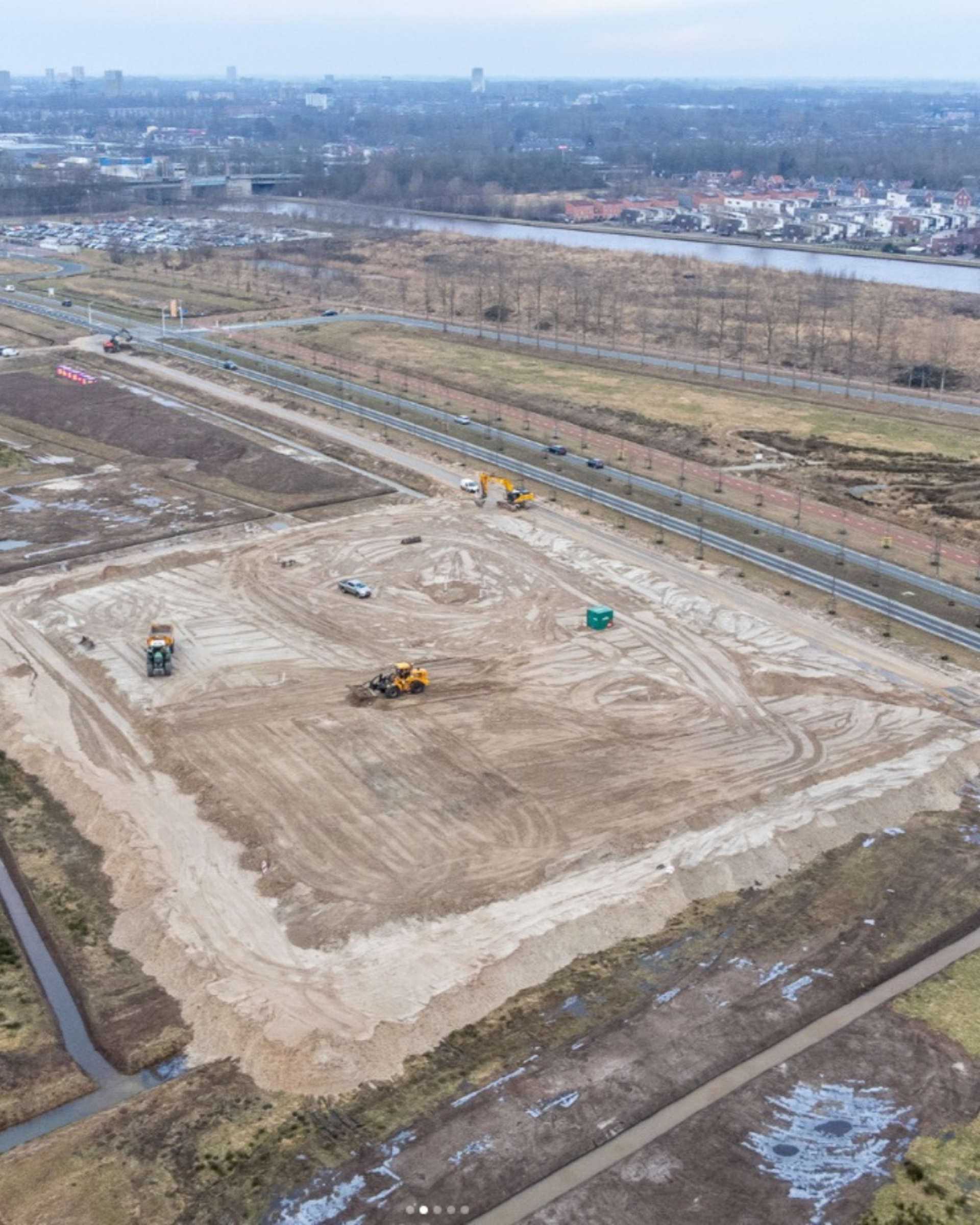 Op het terrein naast de bouwweg is een zanddepot aangelegd, de contouren hiervan zijn duidelijk te zien. Het zanddepot is een tijdelijke opslag voor zand dat we later gebruiken om het gebied verder voor te bereiden. Zo werken we stap voor stap verder aan de ontwikkeling van de nieuwe wijk De Eems.
