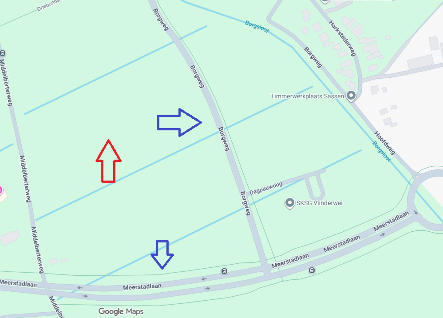 Blauwe pijlen: locaties waar het zand heen gaat.